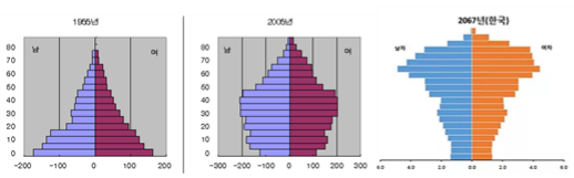 한국의 인구 피라미드는 1955년에 출생률이 높고 사망률도 비슷하여 인구가 증가하는 피라미드형이었다.