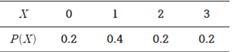 | E(X) = 0*2/10 + 1*4/10 + 2*2/10 + 3*2/10 = 1.4 E(X) = 1.4 |