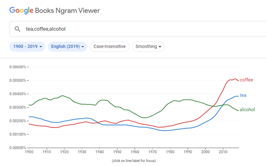 4. 구글 Ngram을 이용하여 tea, coffee, alcohol 비교