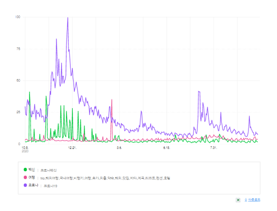 2020년 12월에 강력한 거리두기 조치로 인해 검색량이 급증하였다. 또한 사람들의 불안감으로 인한 백신 요구와 함께 정부의 백신 도입 정책 발표로 백신 키워드의 검색도 함께 늘어났다. 반대로 여행은 더욱 줄어서 바닥에 가까워진 모습을 확인할 수 있다.