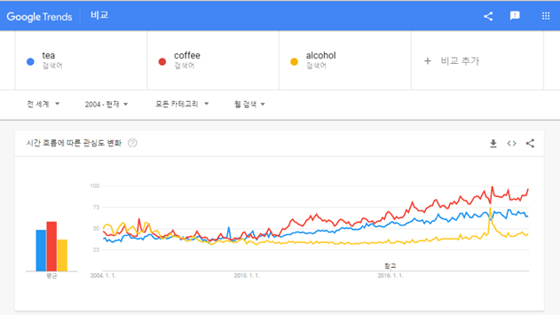 전체적으로 커피 관심도가 엄청 늘었으며 술은 줄어들었다. 차는 대체로 커피의 관심도와 함께 따라서 올라가고 있다.