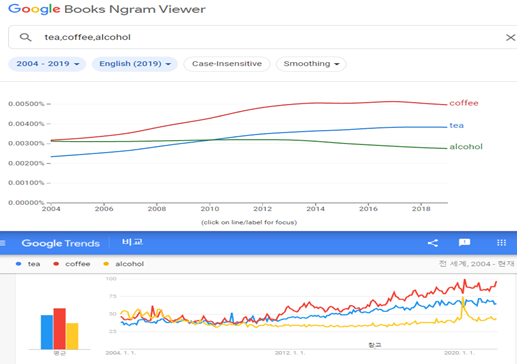 2012년부터 커피에 대한 트렌드가 확 급증했다가 다시 내려왔는데 Ngram에서는 거의 떨어지지 않았으며 오히려 ngram에서 coffee 단어의 집계가 감소되었던 2016~2018 시기에 트렌드에서는 급격히 올라가는 것은 커피의 종류가 세분화 되어 단순히 커피라는 단어보다 다양한 방법으로 커피에 관심을 표현할 수 있어서 그렇다고 볼 수 있다.
