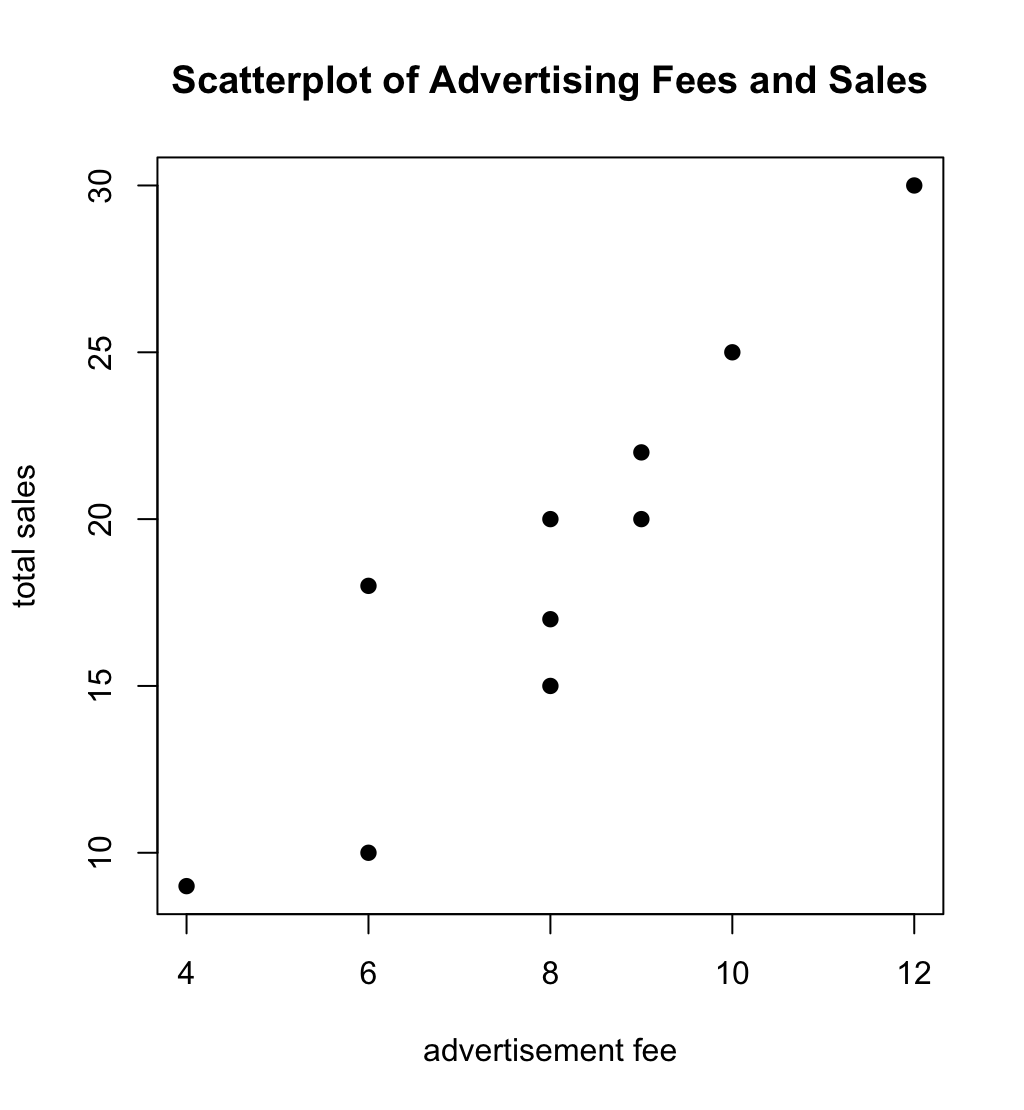 > plot(market$X, market$Y, xlab="advertisement fee", ylab="total sales", pch=19)