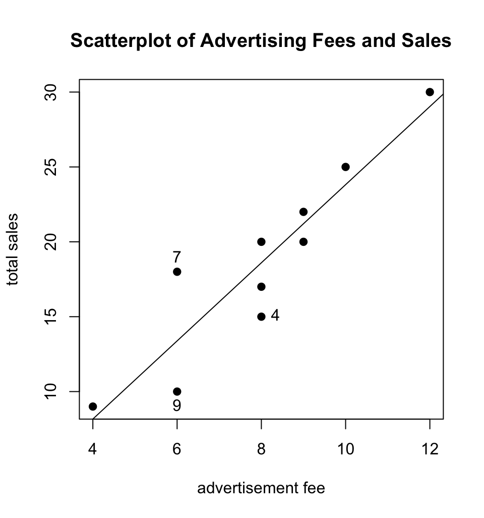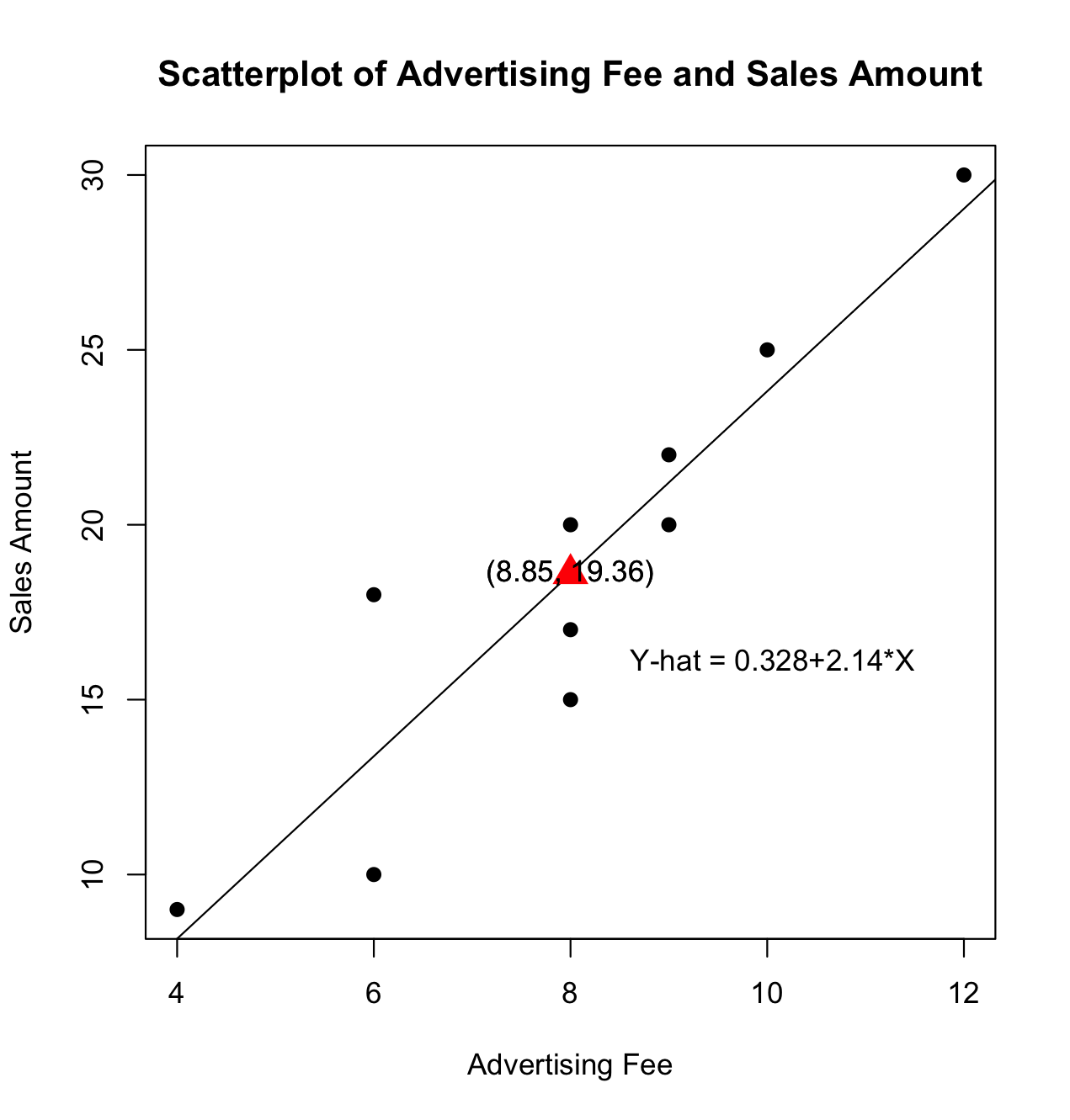 (예) 표본상점의 광고료와 총판매액 자료에 대하여 회귀직선을 구하고, 산점도 위에 회귀직선 그려보기.