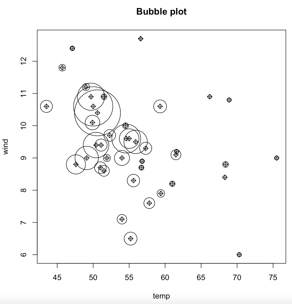 plot(wind~temp, data=USairpollution, pch=9) with(USairpollution, symbols(temp, wind, circle=SO2, inches=0.5, add=T)