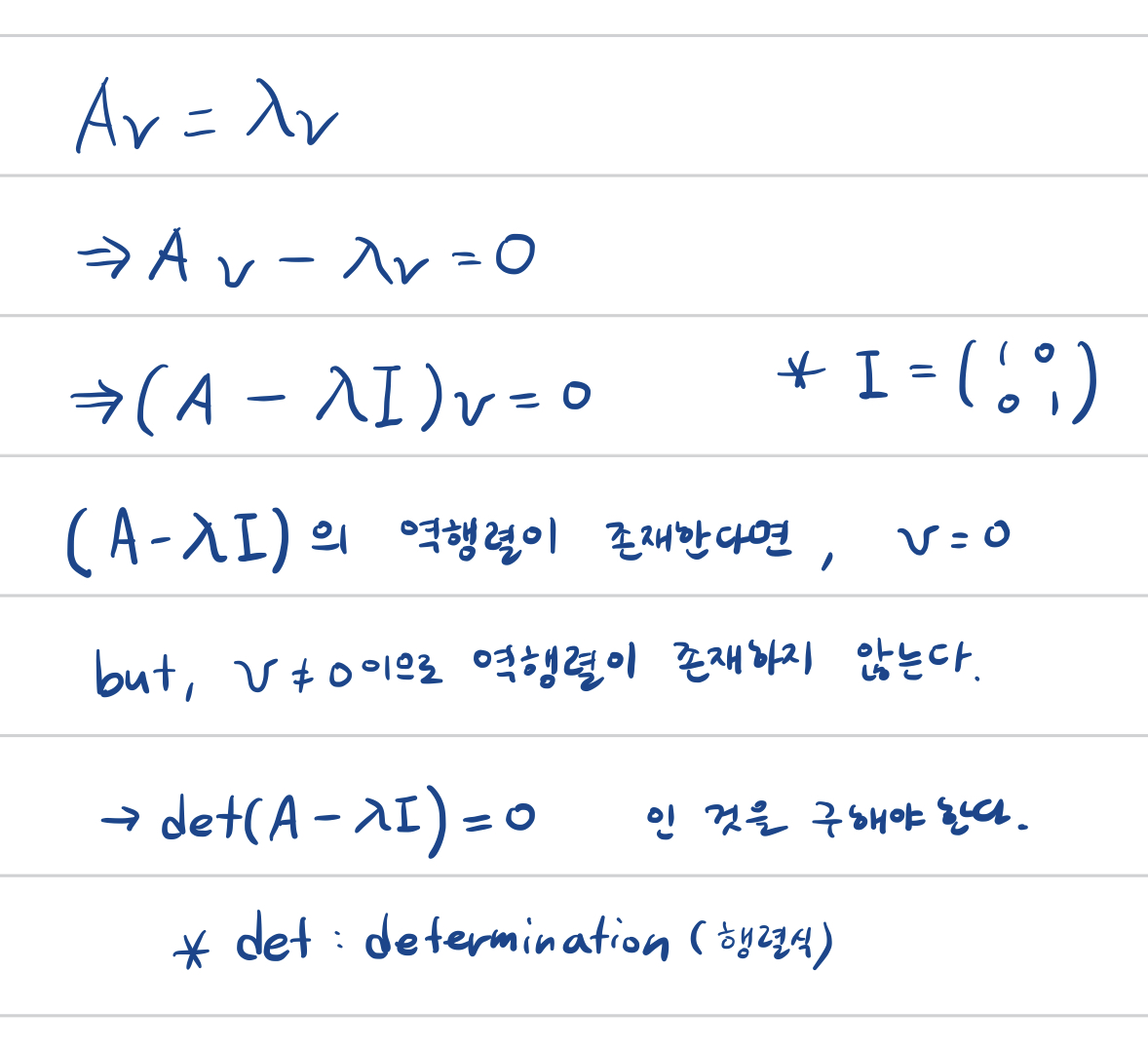 Ax = λx를 만족하는 모든 상수 λ와 0이 아닌 모든 벡터 x (1개 ~ 최대 n 개)를 찾아야 한다.