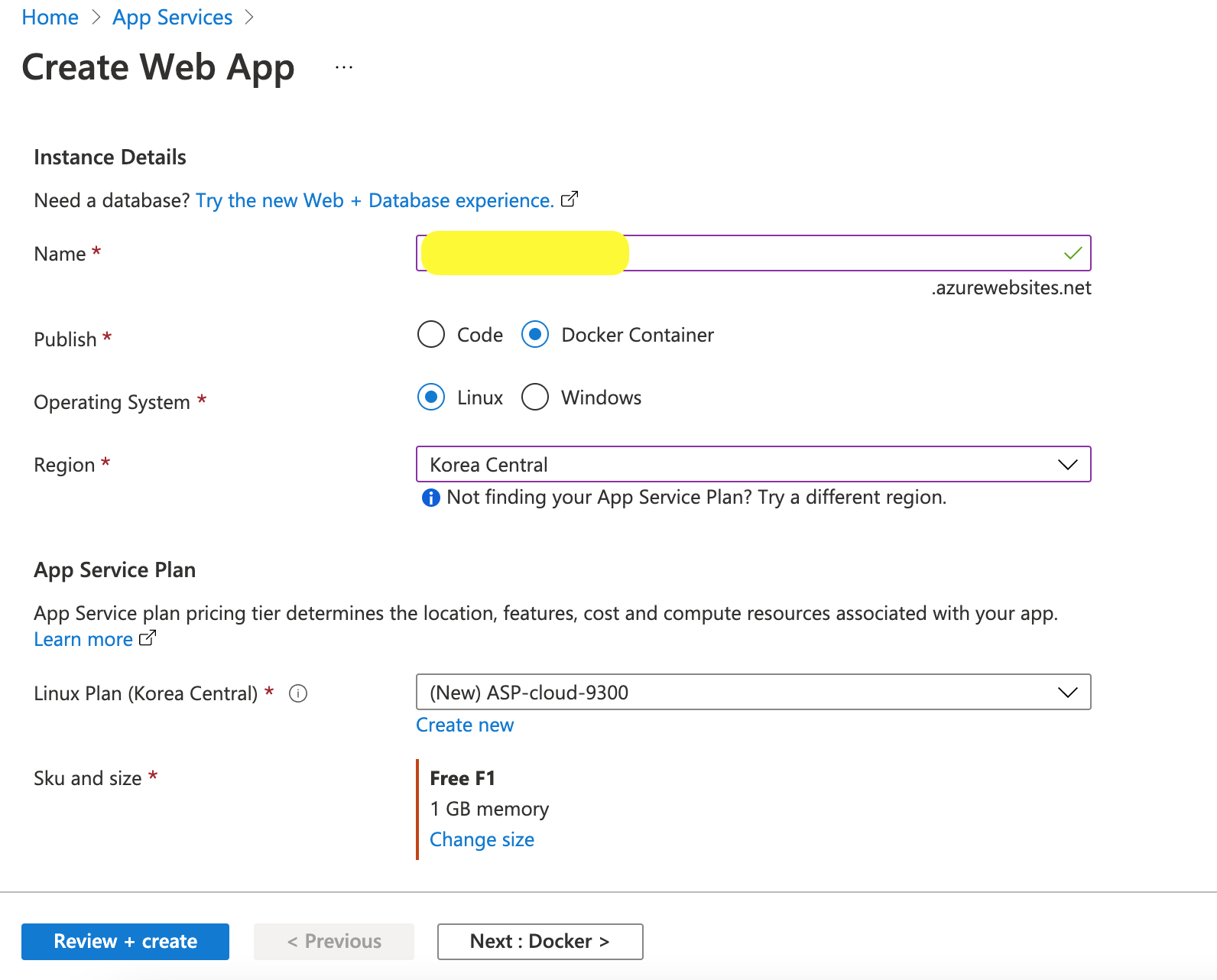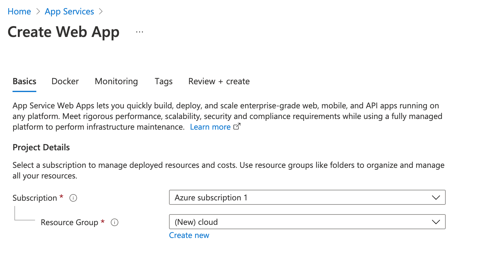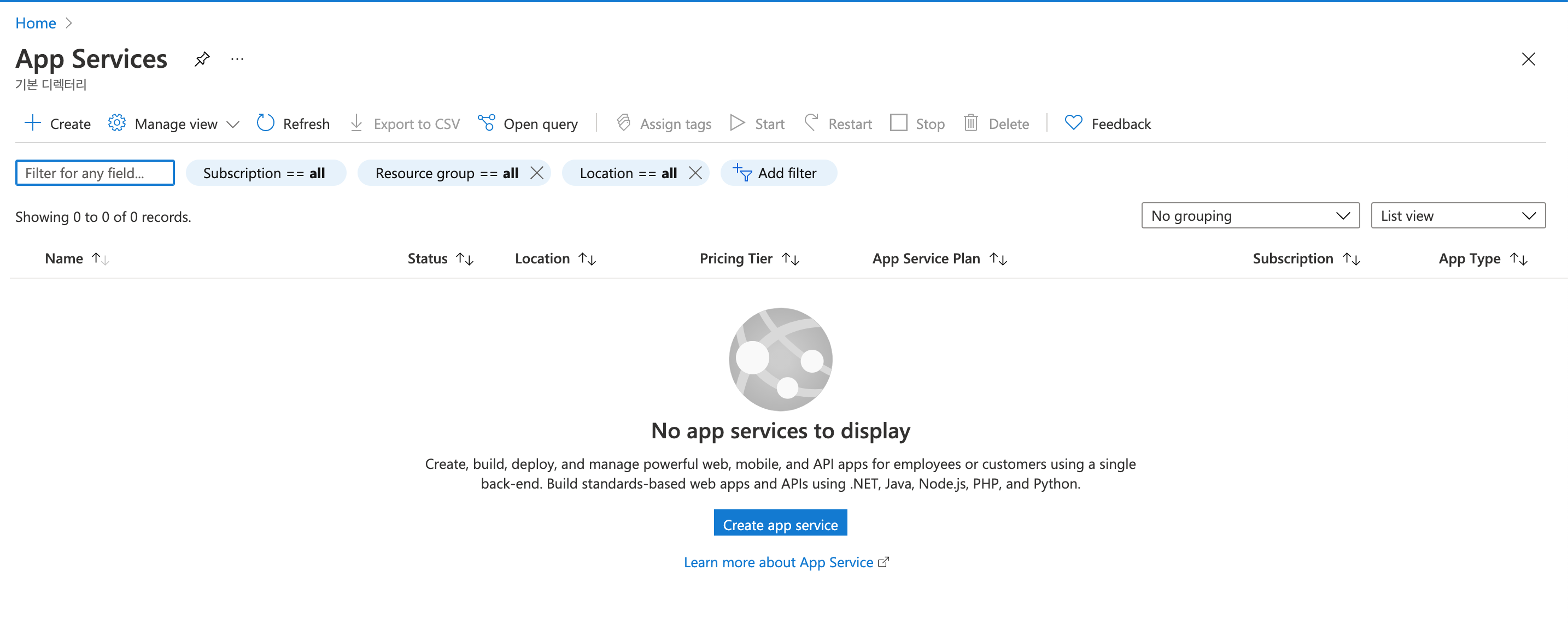 여기서 Crate app Service를 눌러서 생성해봅니다.