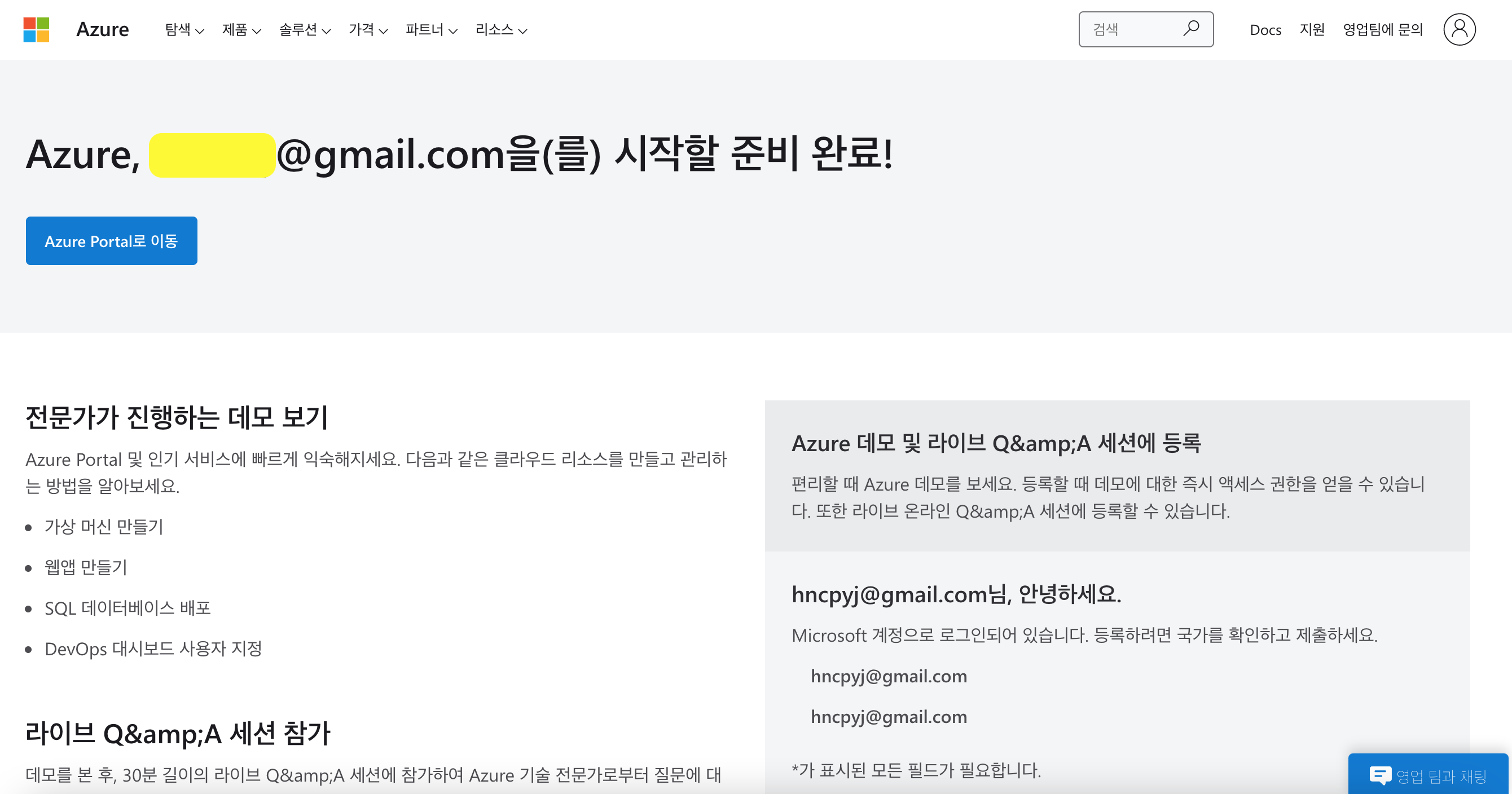 Azure Potal로 이동을 누릅니다