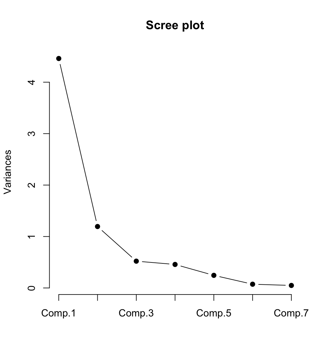 - Scree 그림의 어느 구간에서 꺽은 선의 기울기가 가파르게 떨어진 후 완만한 감소를 보인다면, 그 하강지점에 대응되는 개수의 주성분을 보유하는 것이 바람직하다.