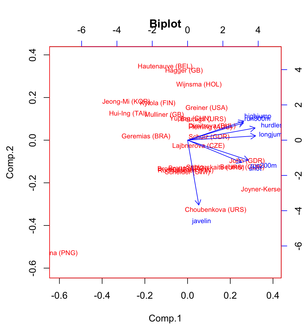 biplot에서 파란색 아래에쪽으로 난 화살표는 창던지기인데 혼자 아래로 튀어나와 있고 다른 것들은 오른쪽 화살표로 몰려있는 것을 보면 3시~4시 방향에 있는 화살표들이 유사한 성향을 나타낸다고 볼 수 있다.