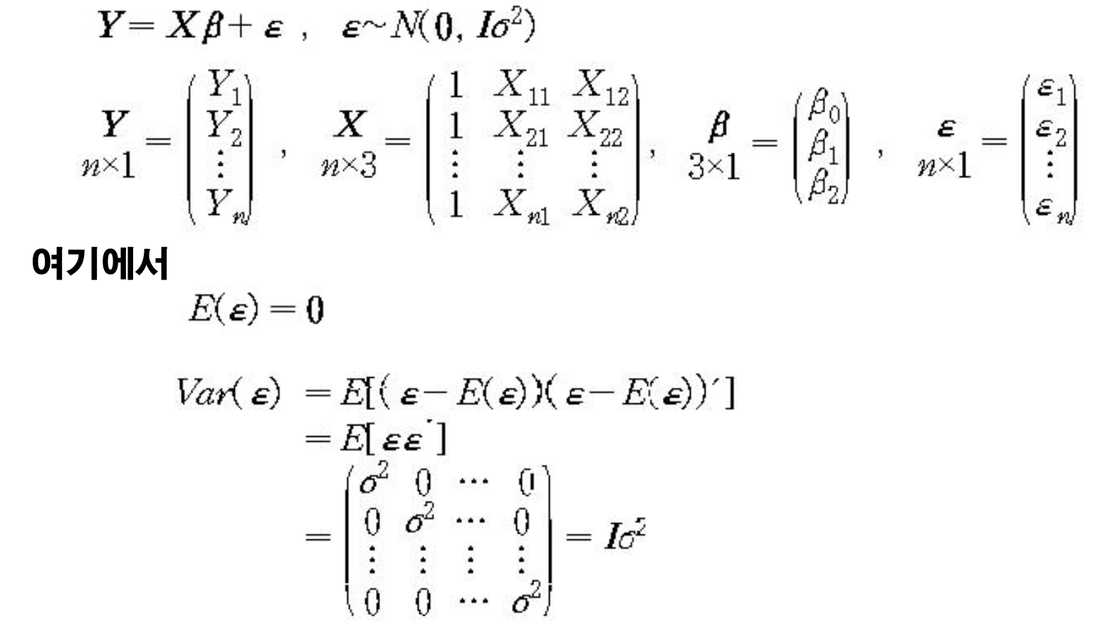 오차항의 기댓값을 구하게 되면 0벡터가 될 것이고 분산을 구하면 단위행렬(I) 곱하기 σ2이 된다.