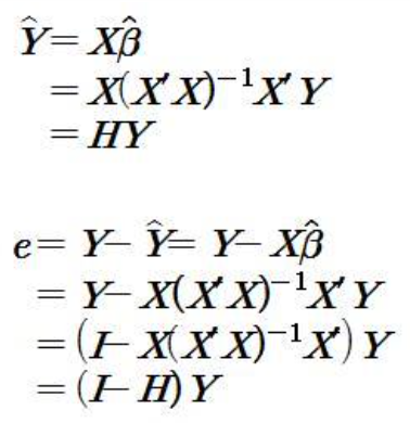 추정값과 잔차벡터의 행렬표현은 아래와 같이 나타내며 이것을 햇행렬이라고 한다.