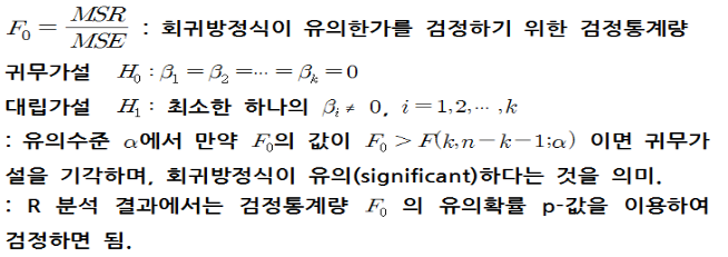 이 회귀모형이 유의한지 설명력이 얼마나 되는지를 알 수 있다.