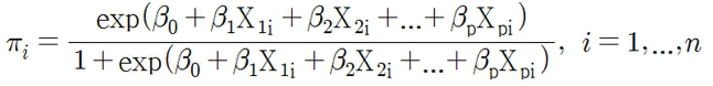 총 n의 객체(subject) 중에 i번째 객체에 대한 두 개의 범주(성공 또는 실패)를 가지는 이항형 목표변수 값을 $Y_i$로 두고 입력변수들의 값을 X1i, X2i, …, Xpi라고 둔다.