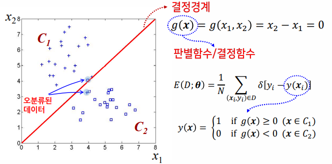 → 분류 오차를 최소화하는 최적의 결정경계 𝑔(𝒙; 𝜽) = 0를 찾는 것 - 성능 평가 척도