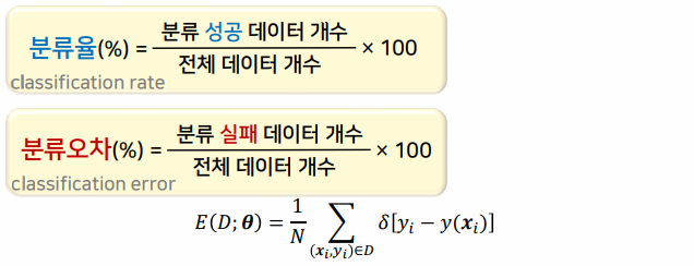 → 분류 오차를 최소화하는 최적의 결정경계 𝑔(𝒙; 𝜽) = 0를 찾는 것 - 성능 평가 척도