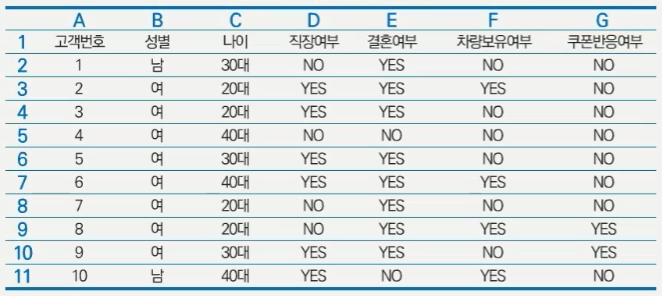 G 쿠폰반응여부가 머신러닝에서 맞춰야 할 타겟값이다. 이것은 나무그림에서 잎사귀에 해당된다.