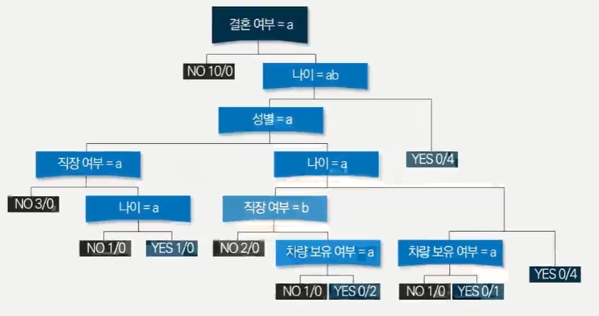 결혼여부 -> 성별 -> 직장여부 -> 차량여부 -> 나이