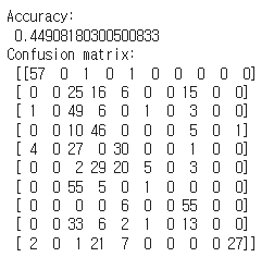 # Accuracy가 약 45%가 나왔다. Accuracy는 정확도다.