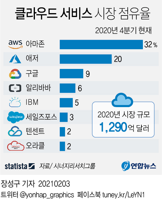 아마존을 필두로 마이크로소프트, 알리바바, 구글 등이 뒤를 잇고 있다.